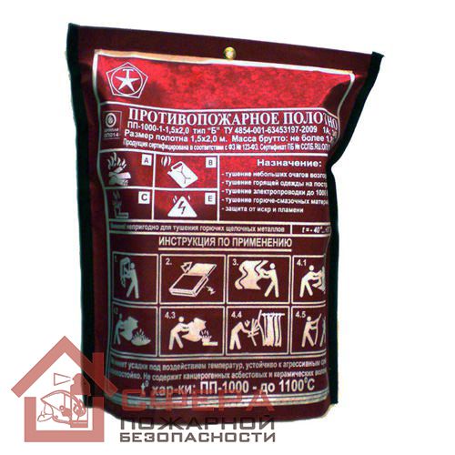 Полотно противопожарное ПП1000 допускается использовать при ликвидации возгораний классов А, В и Е. Изделие уложено в специальный чехол, откуда его можно легко и быстро извлечь при необходимости. Полотно может производиться из асбестовой или стекловолоконной ткани, а также войлока либо брезента. Помимо того, что противопожарное полотно не горит, оно также не проводит электрический ток, не выделяет вредных для человека соединений, устойчиво к действию химикатов.