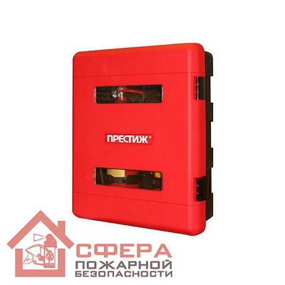 Контейнер для огнетушителя «Престиж-06» предназначен для хранения двух устройств, размещаемых на грузовом автомобильном и водном транспорте. Пожарный шкаф представляет собой пластмассовый короб с крышкой красного цвета, оснащенной двумя смотровыми проемами, закрытыми прозрачным пластиком.