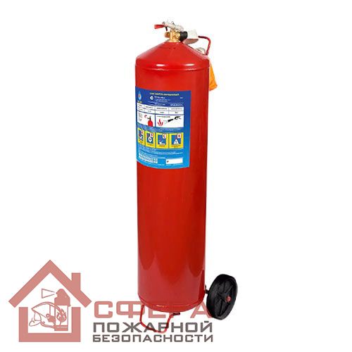 Устройство отличается существенными габаритами и весом. Транспортировка огнетушителя осуществляется с помощью специальных колес и металлической рукоятки. Конструкция состоит из корпуса, запорно-пускового устройства, сифонной трубки, направляющего шланга с распылительным насадком. ОТ активируется после нажатия специального рычага, расположенного на ЗПУ. Подача огнетушащего вещества может осуществляться дозированными частями.