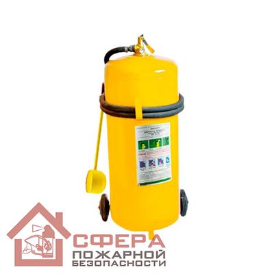 Транспортировка конструкции производится с помощь колесной пары, размещенной в донной части металлического корпуса. Для придания устойчивости конструкции баллон оборудован упором и удобной ручкой. Устройство приводится в действие с помощью специального рычага. После активации прибора состав поступает по направляющему патрубку к очагу возгорания.
