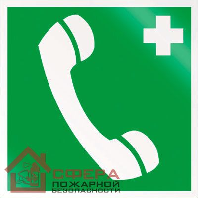 Фотолюминесцентный указатель «Телефон связи с медицинским пунктом» используется для обозначения мест размещения стационарных средств связи, позволяющих обратиться за врачебной помощью. Совместно с указывающими стрелками данный символ может применяться для обозначения направления движения к телефону.